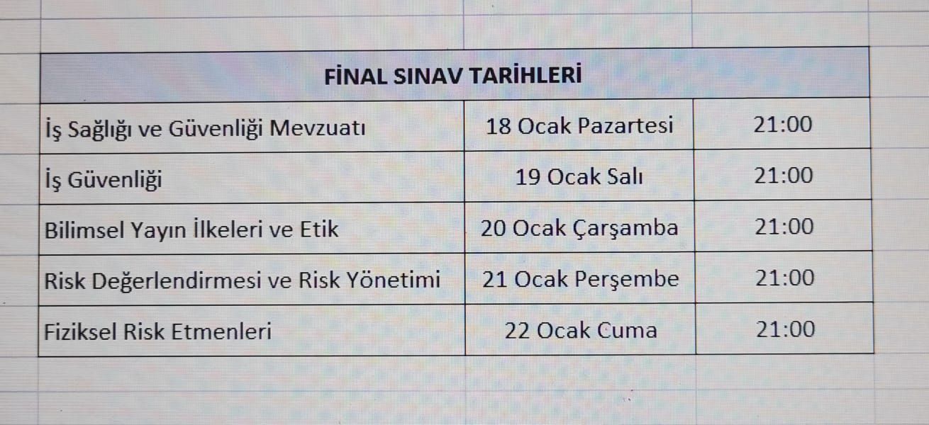 İş Sağlığı ve Güvenliği Anabilim Dalı Final tarihleri