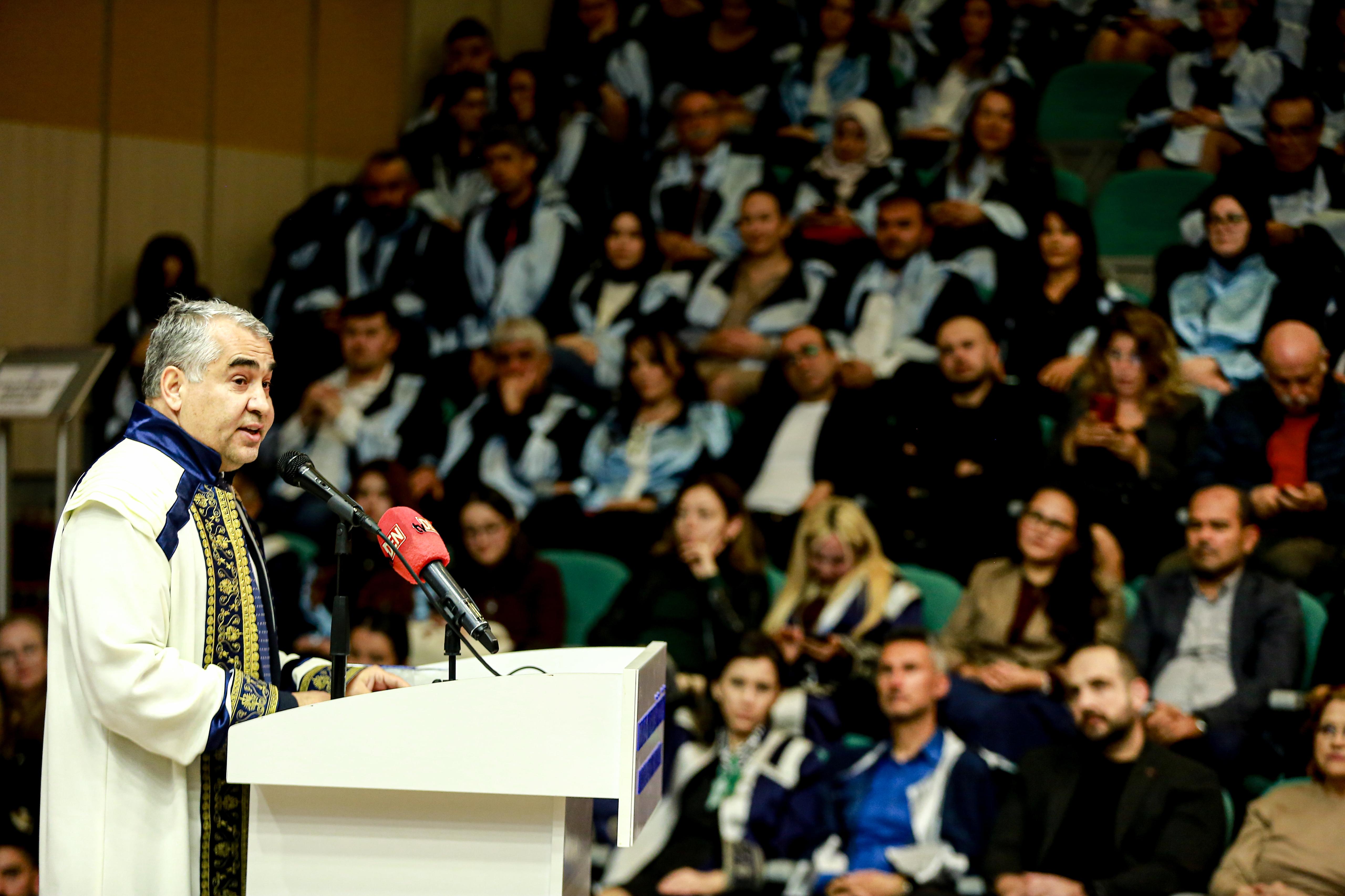 Rektörümüz Prof. Dr. Bülent Kent konuÅŸmasında lisansüstü eÄŸitimin, bireyleri alanlarında uzmanlaÅŸtırmasının yanı sıra sabır, kararlılık, bilimsel etik ve çalışma disiplininin kazandırılmasında büyük rol oynadığını vurgulayarak “Bugün mezun ettiÄŸimiz her bir öÄŸrencimiz artık sadece bir diploma sahibi deÄŸil; bilginin derinliÄŸine inmiÅŸ, analitik düÅŸünceyi benimsemiÅŸ, bilimsel araÅŸtırma kültürünü sorumlulukla taşıyan bireylerdir. Üniversitemizin üç güçlü lisansüstü enstitüsü, köklü bir bilimsel birikimin temsilcileridir.” dedi.