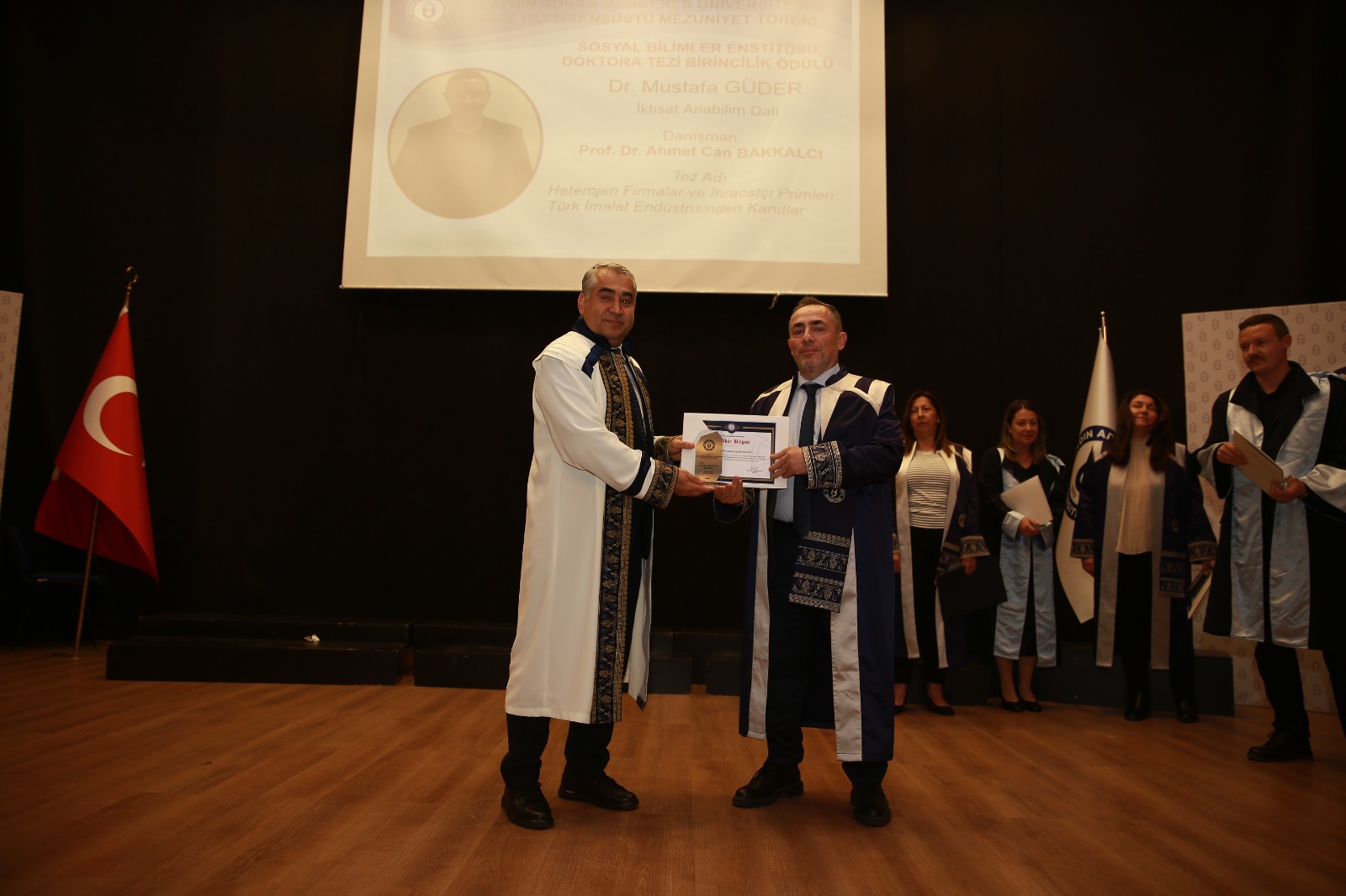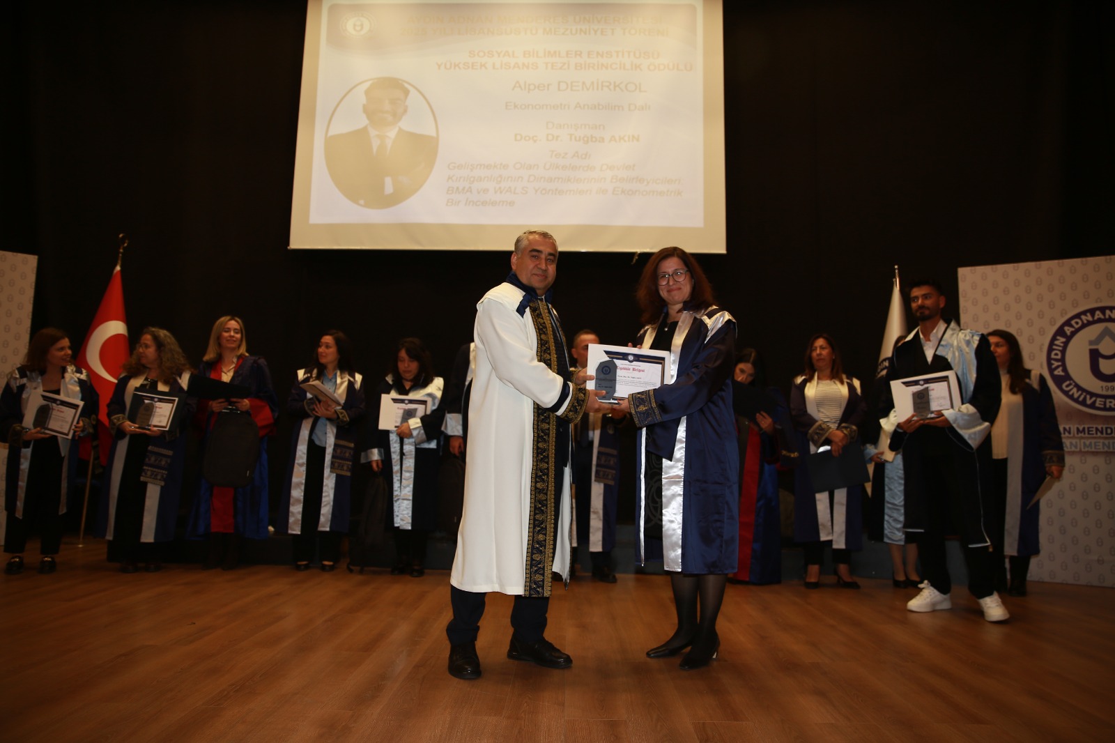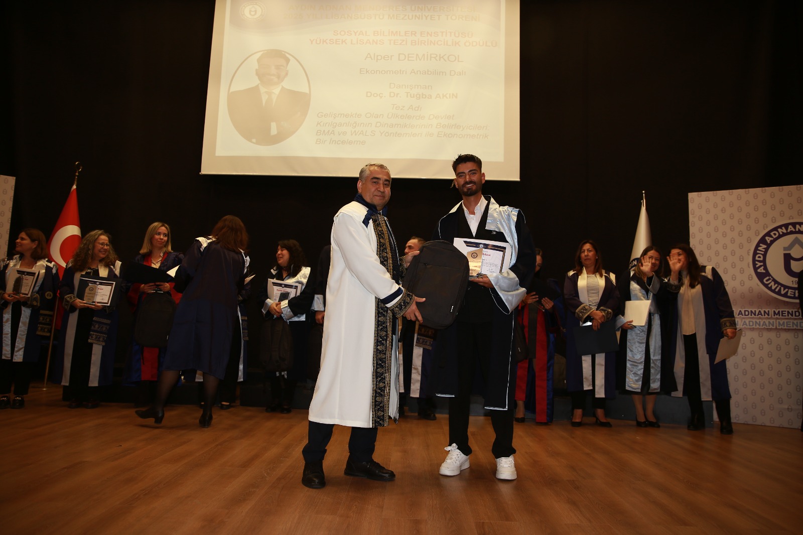 Aydın Adnan Menderes Üniversitesi Sosyal Bilimler Enstitüsü tarafından lisansüstü programlarda nitelikli akademik çalışmaları teşvik etmek amacıyla verilen 2025 Yılı Lisansüstü Tez Birincilik Ödülleri, mezuniyet töreninde sahiplerini buldu.